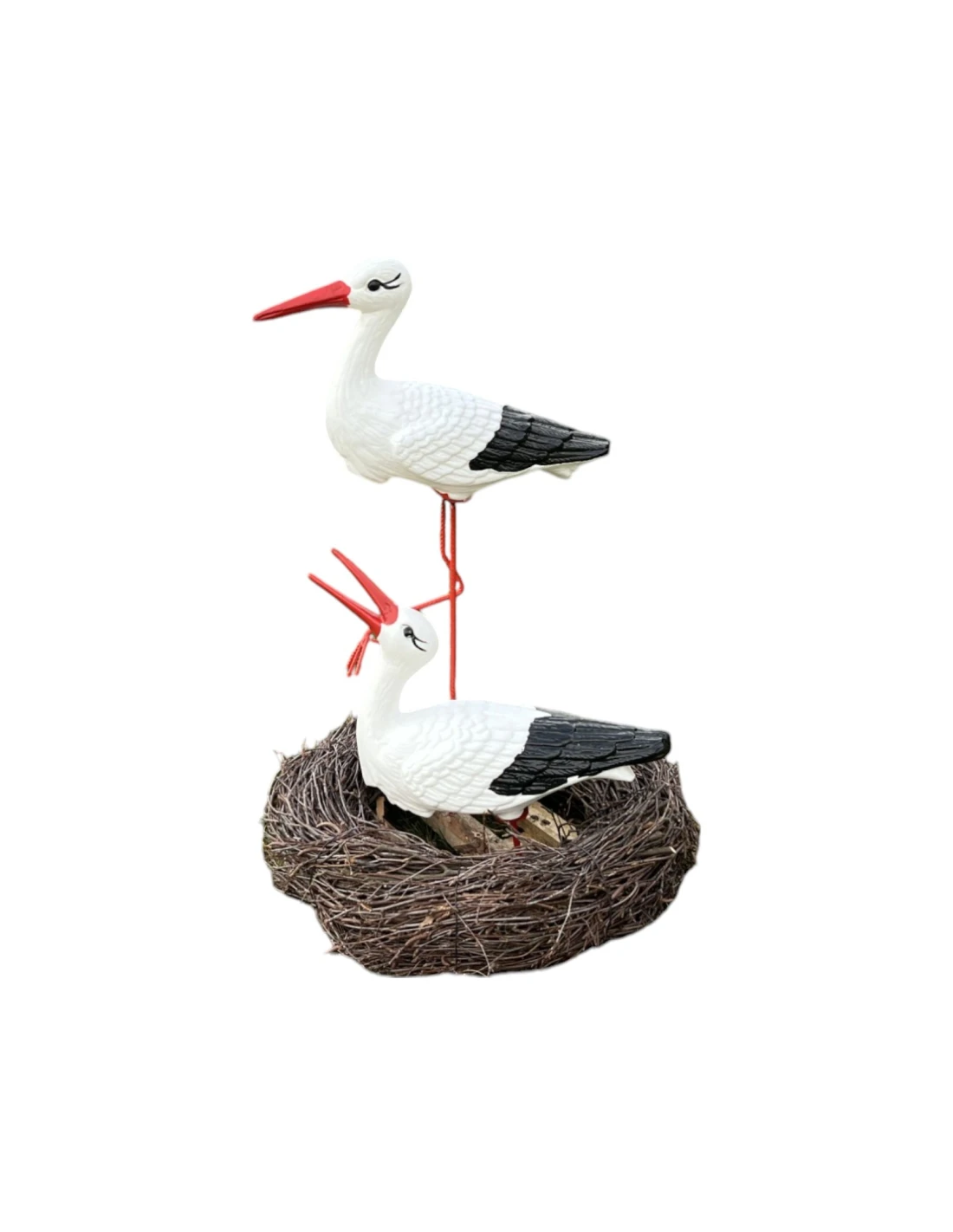 • Ensemble complet – comprend une cigogne moyenne, une cigogne claquante et un nid élégant formant une composition harmonieuse.