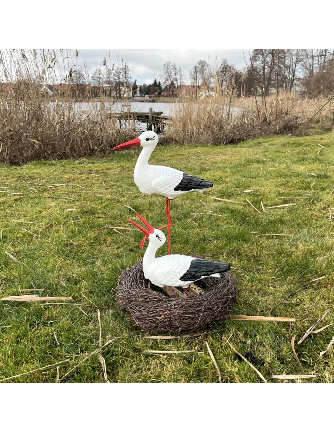 • Construction robuste – cigognes en polyuréthane résistant aux chocs, pieds en métal, et nid en branches de bouleau renforcées par une base en bois.